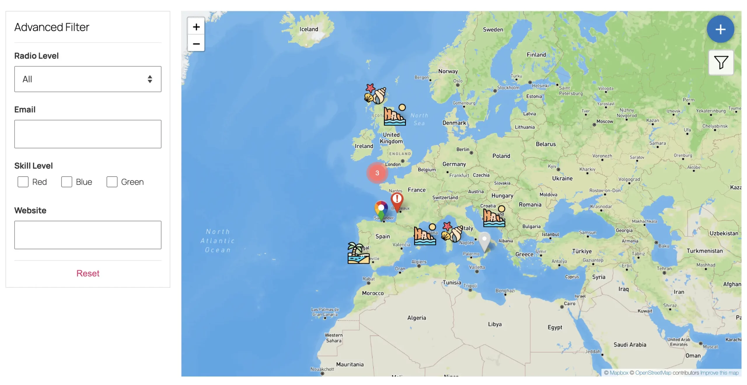 The Advanced Filter Interface allows you to display a filter area next to or above your map. Visitors can filter locations based on any custom fields you have configured. This provides more detailed filtering options than Marker Categories alone.